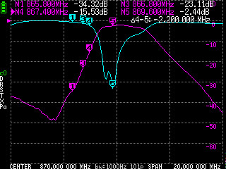 After some very careful fine-tuning markers 1-4, the frequencies which we would like to reject, were down to -15dB to -35dB. Not too shabby! S11 is -33dB, S21 is -2.4dB so we have a filter which we can compare directly to the SAW filter currently on site.