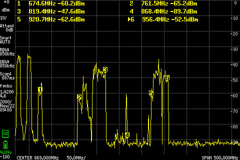 That large spike is four, essentially continuous transmissions. A cacophony of “Non specific short range devices” and very loud! Fortunately they are a few MHz away from our QRG. Perhaps we need a tighter filter…