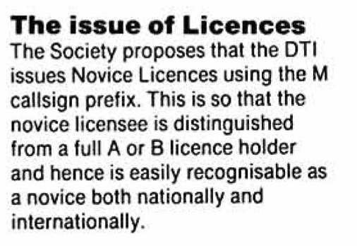 September 1989 RadCom reported the RSGB had suggested to the then regulator, the DTI, the use of the “M” prefix for Novice callsigns but “2” was eventually chosen by the new regulator, the Radiocommunications Agency (RA) in 1991