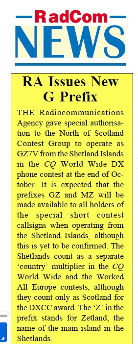 In 2000 Short Contest Callsigns with MZ and GZ prefixes were introduced for use in the Shetland Islands, RSGB December 2000 RadCom announcement